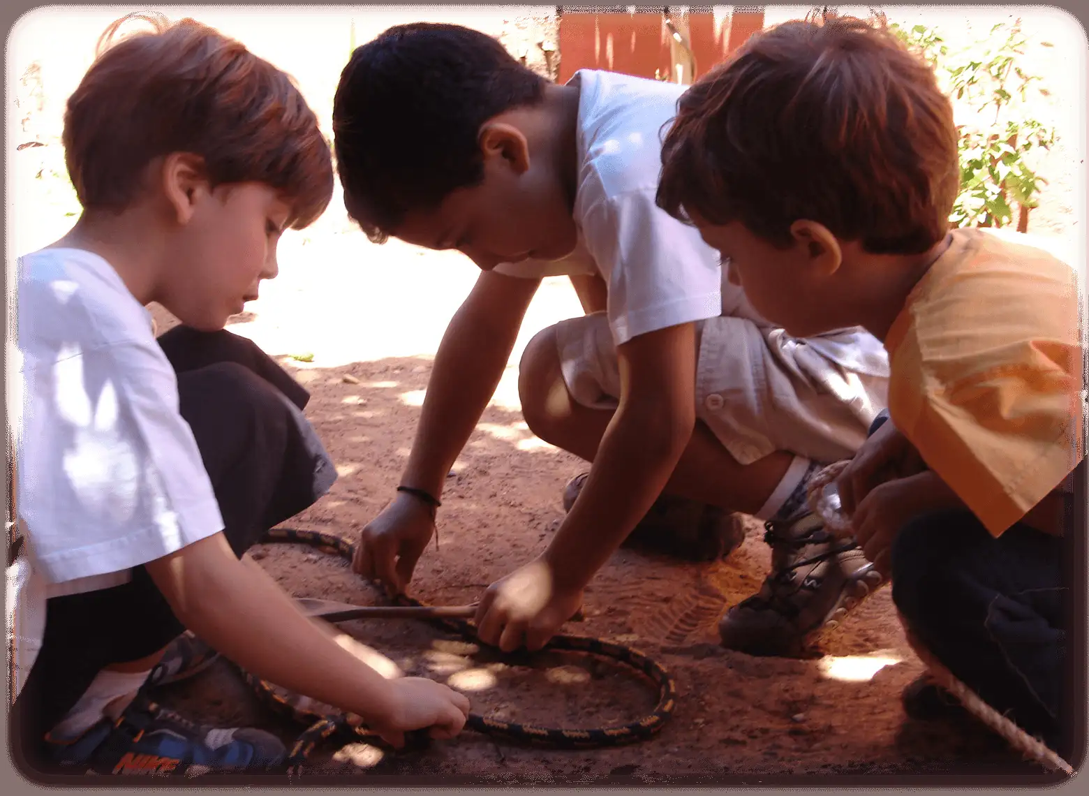 A criança tem à sua disposição tocos de madeira, sementes de variadas formas, tamanhos e quantidades, areia, pedras, folhas, massa de modelar, brinquedos, que são instrumentos para essa exploração do mundo.